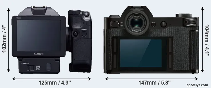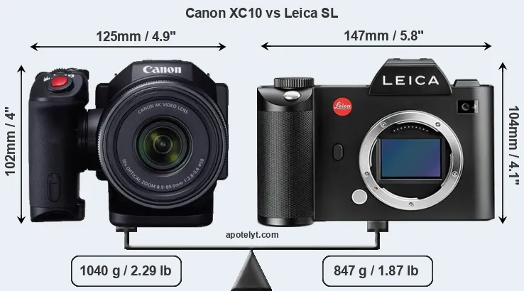 If the front view area (width x height) of the cameras is taken as an aggregate measure of their size, the Leica SL is notably larger (20 percent) than the Canon XC10. It is noteworthy in this context that the Leica SL is splash and dust-proof, while the XC10 does not feature any corresponding weather-sealing.
