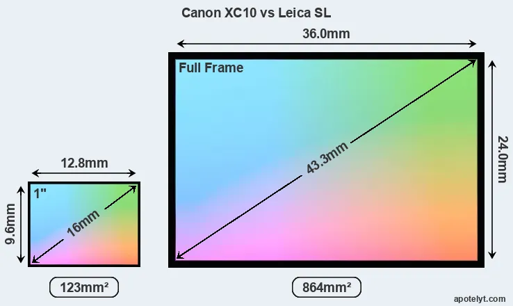 Of the two cameras under consideration, the Canon XC10 features an one-inch sensor and the Leica SL a full frame sensor. The sensor area in the Leica SL is 602 percent bigger. As a result of these sensor size differences, the cameras have a format factor of, respectively, 2.75 and 1.0. The sensor in the XC10 has a native 4:3 aspect ratio, while the one in the Leica SL offers a 3:2 aspect.