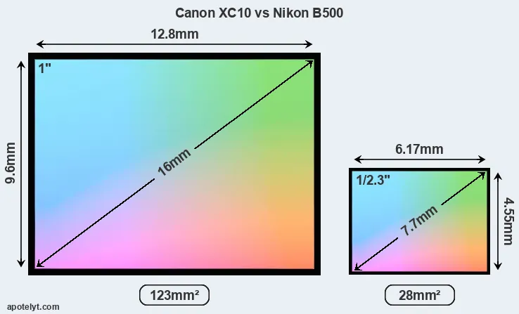 Of the two cameras under consideration, the Canon XC10 features an one-inch sensor and the Nikon B500 a 1/2.3-inch sensor. The sensor area in the B500 is 77 percent smaller. As a result of these sensor size differences, the cameras have a format factor of, respectively, 2.75 and 5.6. Both cameras feature a native aspect ratio (sensor width to sensor height) of 4:3.