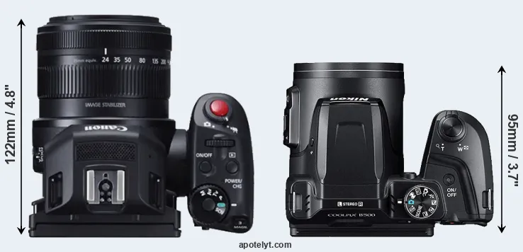 The side-by-side display below illustrates the physical size and weight of the Canon XC10 and the Nikon B500. The two cameras are presented according to their relative size. Three successive views from the front, the top, and the rear are shown. All width, height and depth measures are rounded to the nearest millimeter.