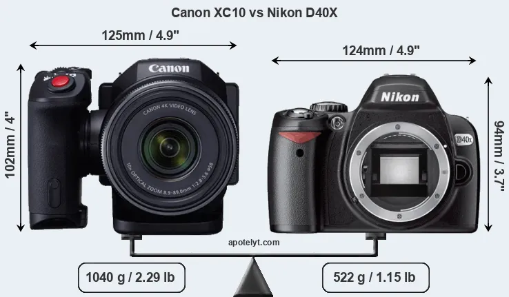 The physical size and weight of the Canon XC10 and the Nikon D40X are illustrated in the side-by-side display below. The two cameras are presented according to their relative size. Three consecutive perspectives from the front, the top, and the back are available. All width, height and depth dimensions are rounded to the nearest millimeter.