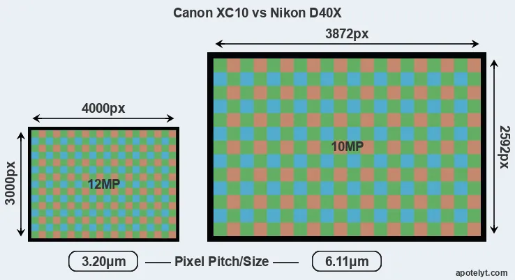 Despite having a smaller sensor, the Canon XC10 offers a higher resolution of 12 megapixels, compared with 10 MP of the Nikon D40X. This megapixels advantage comes at the cost of a higher pixel density and a smaller size of the individual pixel (with a pixel pitch of 3.20μm versus 6.11μm for the D40X). However, it should be noted that the XC10 is much more recent (by 8 years and 1 month) than the D40X, and its sensor will have benefitted from technological advances during this time that make it possible to gather light more efficiently.