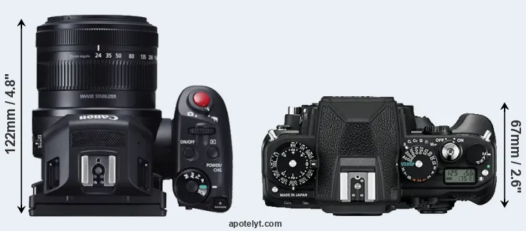 The side-by-side display below illustrates the physical size and weight of the Canon XC10 and the Nikon Df. The two cameras are presented according to their relative size. Three consecutive views from the front, the top, and the rear side are shown. All width, height and depth dimensions are rounded to the nearest millimeter.