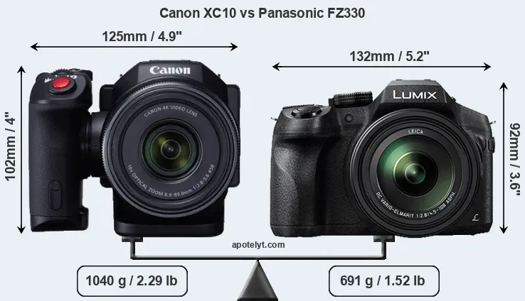 If the front view area (width x height) of the cameras is taken as an aggregate measure of their size, the Panasonic FZ330 is somewhat smaller (5 percent) than the Canon XC10. Moreover, the FZ330 is markedly lighter (34 percent) than the XC10. It is noteworthy in this context that the FZ330 is splash and dust-proof, while the XC10 does not feature any corresponding weather-sealing.