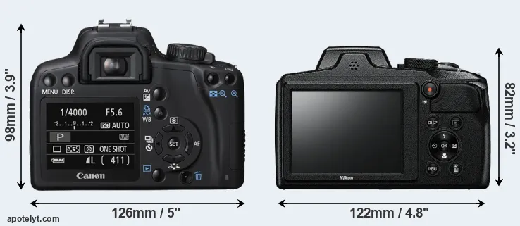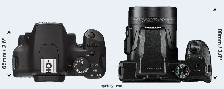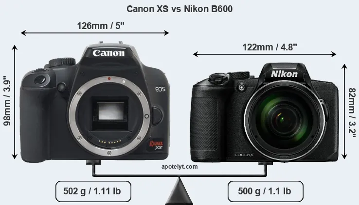 The side-by-side display below illustrates the physical size and weight of the Canon XS and the Nikon B600. The two cameras are presented according to their relative size. Three successive views from the front, the top, and the rear are shown. All size dimensions are rounded to the nearest millimeter.