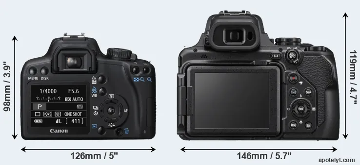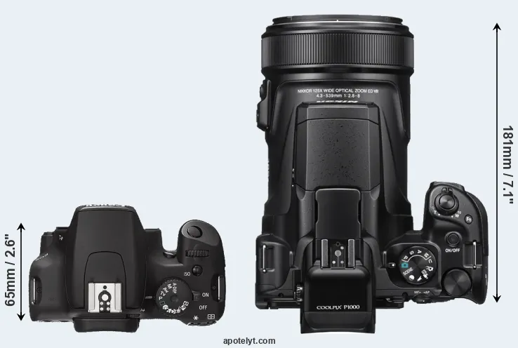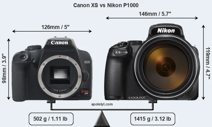 The side-by-side display below illustrates the physical size and weight of the Canon XS and the Nikon P1000. The two cameras are presented according to their relative size. Three consecutive perspectives from the front, the top, and the back are available. All width, height and depth dimensions are rounded to the nearest millimeter.