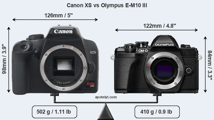 If the front view area (width x height) of the cameras is taken as an aggregate measure of their size, the Olympus E-M10 III is notably smaller (17 percent) than the Canon XS. Moreover, the E-M10 III is markedly lighter (18 percent) than the XS. In this context, it is worth noting that neither the XS nor the E-M10 III are weather-sealed.