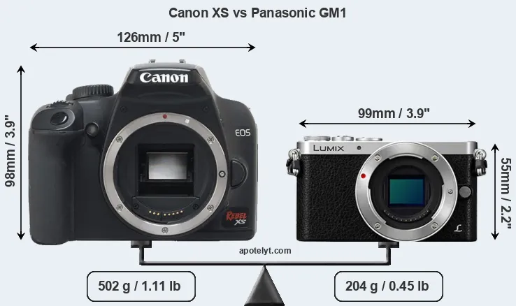 The physical size and weight of the Canon XS and the Panasonic GM1 are illustrated in the side-by-side display below. The two cameras are presented according to their relative size. Three consecutive perspectives from the front, the top, and the back are available. All size dimensions are rounded to the nearest millimeter.