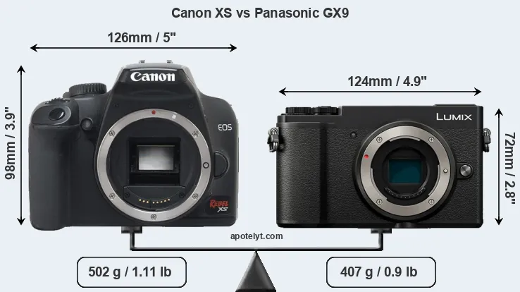 The physical size and weight of the Canon XS and the Panasonic GX9 are illustrated in the side-by-side display below. The two cameras are presented according to their relative size. Three consecutive views from the front, the top, and the rear side are shown. All width, height and depth measures are rounded to the nearest millimeter.