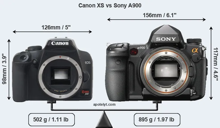 If the front view area (width x height) of the cameras is taken as an aggregate measure of their size, the Sony A900 is considerably larger (48 percent) than the Canon XS. Moreover, the A900 is substantially heavier (78 percent) than the XS. It is noteworthy in this context that the A900 is splash and dust-proof, while the XS does not feature any corresponding weather-sealing.