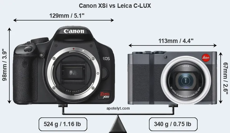 The physical size and weight of the Canon XSi and the Leica C-LUX are illustrated in the side-by-side display below. The two cameras are presented according to their relative size. Three consecutive views from the front, the top, and the rear side are shown. All width, height and depth measures are rounded to the nearest millimeter.