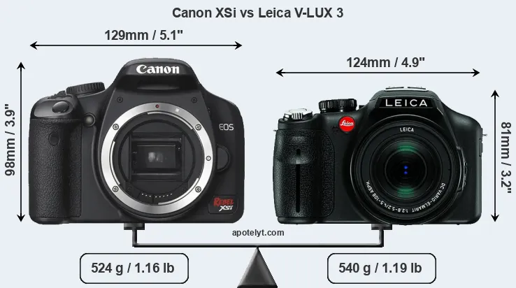 The physical size and weight of the Canon XSi and the Leica V-LUX 3 are illustrated in the side-by-side display below. The two cameras are presented according to their relative size. Three successive views from the front, the top, and the rear are shown. All width, height and depth measures are rounded to the nearest millimeter.