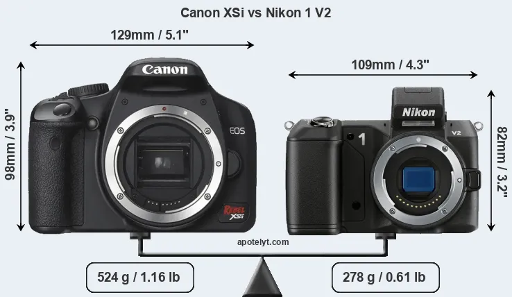 An illustration of the physical size and weight of the Canon XSi and the Nikon 1 V2 is provided in the side-by-side display below. The two cameras are presented according to their relative size. Three consecutive perspectives from the front, the top, and the back are available. All size dimensions are rounded to the nearest millimeter.