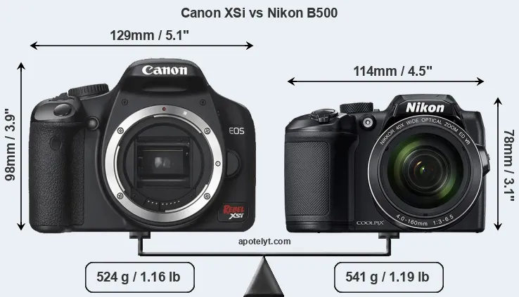 The side-by-side display below illustrates the physical size and weight of the Canon XSi and the Nikon B500. The two cameras are presented according to their relative size. Three successive views from the front, the top, and the rear are shown. All width, height and depth measures are rounded to the nearest millimeter.