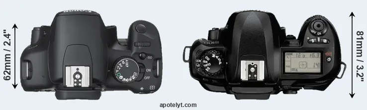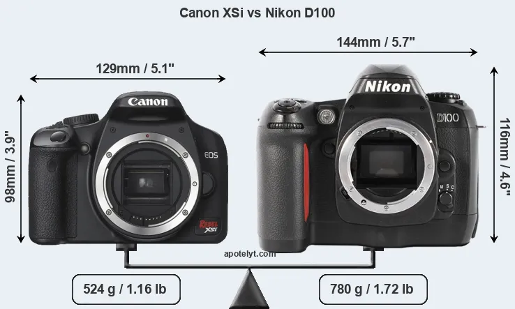 The physical size and weight of the Canon XSi and the Nikon D100 are illustrated in the side-by-side display below. The two cameras are presented according to their relative size. Three consecutive perspectives from the front, the top, and the back are available. All size dimensions are rounded to the nearest millimeter.