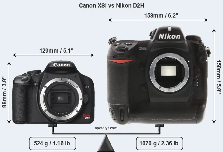 An illustration of the physical size and weight of the Canon XSi and the Nikon D2H is provided in the side-by-side display below. The two cameras are presented according to their relative size. Three consecutive views from the front, the top, and the rear side are shown. All width, height and depth dimensions are rounded to the nearest millimeter.