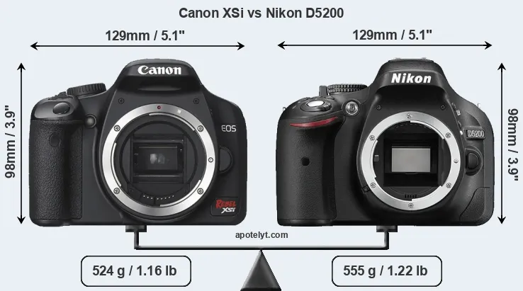 An illustration of the physical size and weight of the Canon XSi and the Nikon D5200 is provided in the side-by-side display below. The two cameras are presented according to their relative size. Three consecutive perspectives from the front, the top, and the back are available. All size dimensions are rounded to the nearest millimeter.