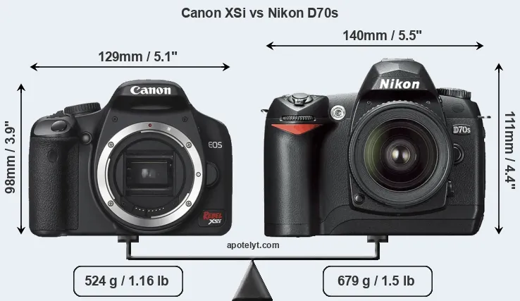 The physical size and weight of the Canon XSi and the Nikon D70s are illustrated in the side-by-side display below. The two cameras are presented according to their relative size. Three consecutive views from the front, the top, and the rear side are shown. All width, height and depth dimensions are rounded to the nearest millimeter.