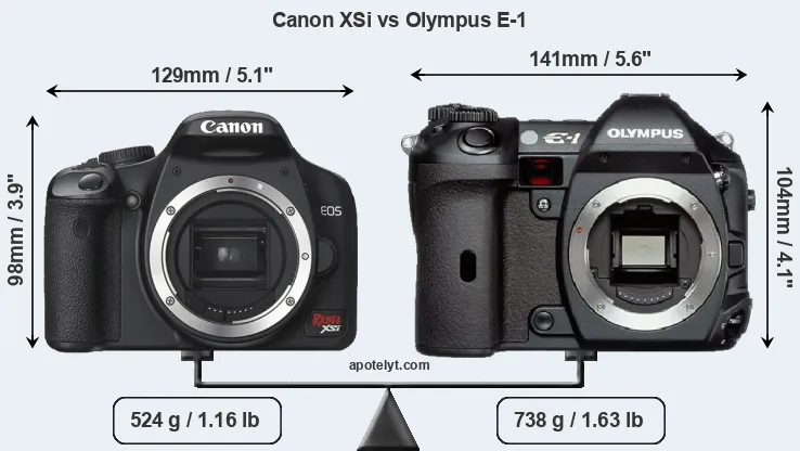 If the front view area (width x height) of the cameras is taken as an aggregate measure of their size, the Olympus E-1 is notably larger (16 percent) than the Canon XSi. Moreover, the E-1 is substantially heavier (41 percent) than the XSi. It is noteworthy in this context that the E-1 is splash and dust-proof, while the XSi does not feature any corresponding weather-sealing.