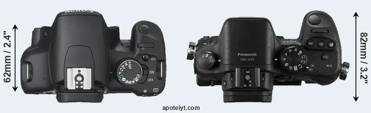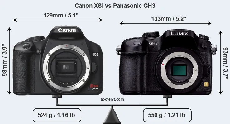 An illustration of the physical size and weight of the Canon XSi and the Panasonic GH3 is provided in the side-by-side display below. The two cameras are presented according to their relative size. Three consecutive views from the front, the top, and the rear side are shown. All width, height and depth measures are rounded to the nearest millimeter.