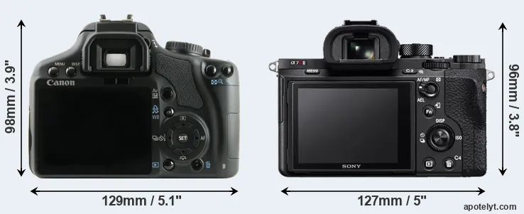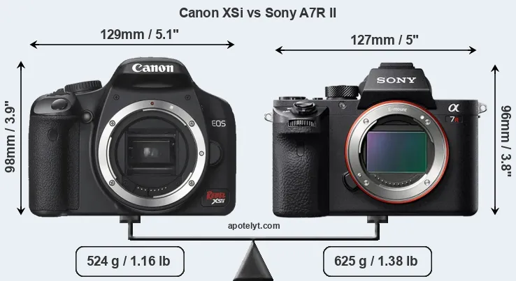If the front view area (width x height) of the cameras is taken as an aggregate measure of their size, the Sony A7R II is somewhat smaller (4 percent) than the Canon XSi. However, the A7R II is markedly heavier (19 percent) than the XSi. It is noteworthy in this context that the A7R II is splash and dust-proof, while the XSi does not feature any corresponding weather-sealing.