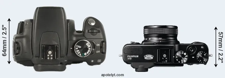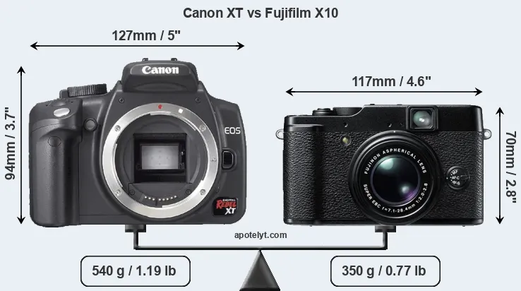The physical size and weight of the Canon XT and the Fujifilm X10 are illustrated in the side-by-side display below. The two cameras are presented according to their relative size. Three consecutive perspectives from the front, the top, and the back are available. All width, height and depth dimensions are rounded to the nearest millimeter.
