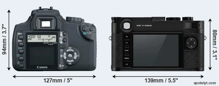 The physical size and weight of the Canon XT and the Leica M10-P are illustrated in the side-by-side display below. The two cameras are presented according to their relative size. Three consecutive perspectives from the front, the top, and the back are available. All width, height and depth dimensions are rounded to the nearest millimeter.