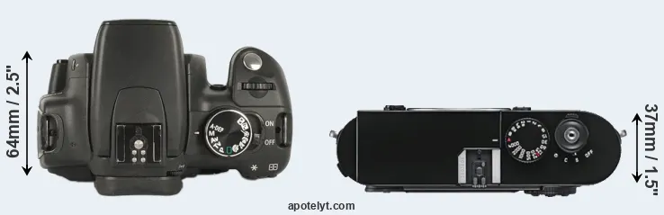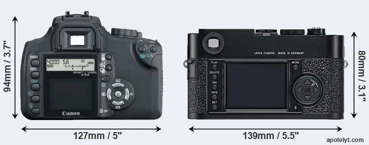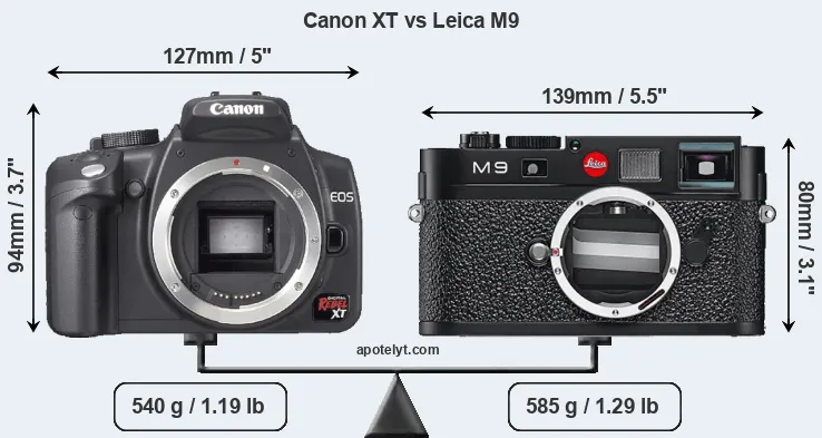 An illustration of the physical size and weight of the Canon XT and the Leica M9 is provided in the side-by-side display below. The two cameras are presented according to their relative size. Three consecutive perspectives from the front, the top, and the back are available. All width, height and depth measures are rounded to the nearest millimeter.