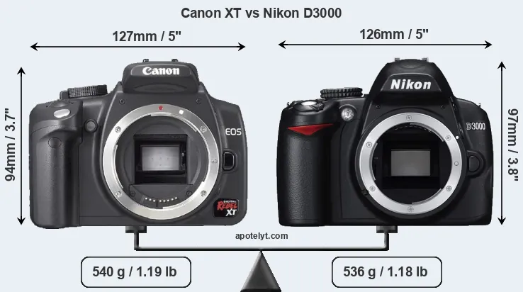 An illustration of the physical size and weight of the Canon XT and the Nikon D3000 is provided in the side-by-side display below. The two cameras are presented according to their relative size. Three successive views from the front, the top, and the rear are shown. All width, height and depth dimensions are rounded to the nearest millimeter.