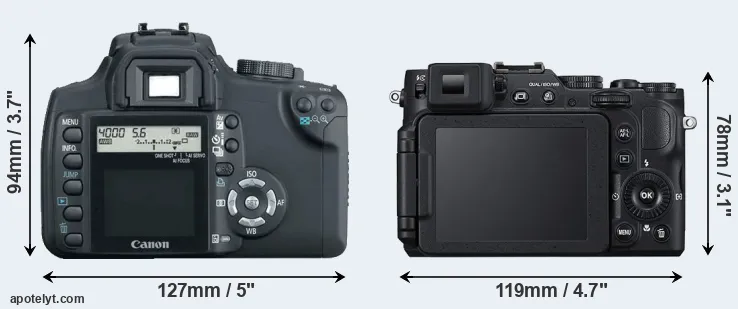 If the front view area (width x height) of the cameras is taken as an aggregate measure of their size, the Nikon P7800 is notably smaller (22 percent) than the Canon XT. In this context, it is worth noting that neither the XT nor the P7800 are weather-sealed.