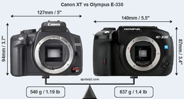 If the front view area (width x height) of the cameras is taken as an aggregate measure of their size, the Olympus E-330 is somewhat larger (2 percent) than the Canon XT. Moreover, the E-330 is markedly heavier (18 percent) than the XT. In this context, it is worth noting that neither the XT nor the E-330 are weather-sealed.