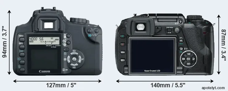 | 12. | Canon XTi | 127 mm | 84 mm | 65 mm | 556 g | 370 | n | Aug 2006 | US$ 799 | ebay.com | |