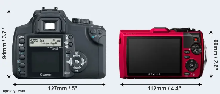 The side-by-side display below illustrates the physical size and weight of the Canon XT and the Olympus TG-4. The two cameras are presented according to their relative size. Three consecutive perspectives from the front, the top, and the back are available. All width, height and depth dimensions are rounded to the nearest millimeter.