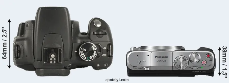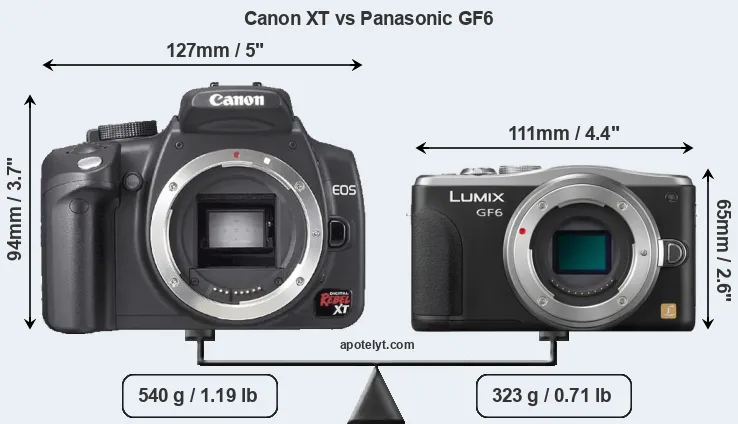 An illustration of the physical size and weight of the Canon XT and the Panasonic GF6 is provided in the side-by-side display below. The two cameras are presented according to their relative size. Three consecutive perspectives from the front, the top, and the back are available. All width, height and depth measures are rounded to the nearest millimeter.