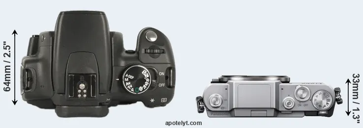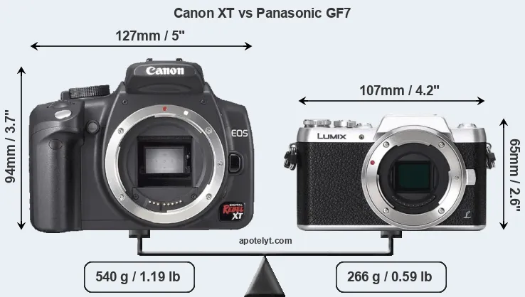 An illustration of the physical size and weight of the Canon XT and the Panasonic GF7 is provided in the side-by-side display below. The two cameras are presented according to their relative size. Three consecutive perspectives from the front, the top, and the back are available. All width, height and depth measures are rounded to the nearest millimeter.