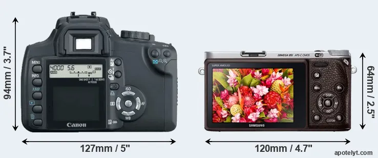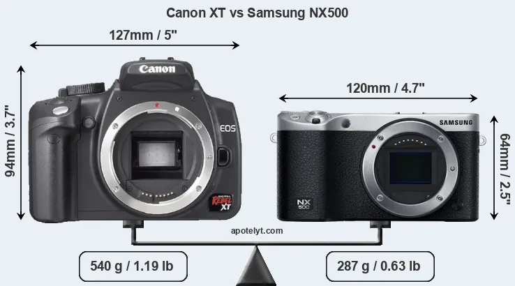 If the front view area (width x height) of the cameras is taken as an aggregate measure of their size, the Samsung NX500 is considerably smaller (36 percent) than the Canon XT. Moreover, the NX500 is substantially lighter (47 percent) than the XT. In this context, it is worth noting that neither the XT nor the NX500 are weather-sealed.