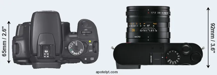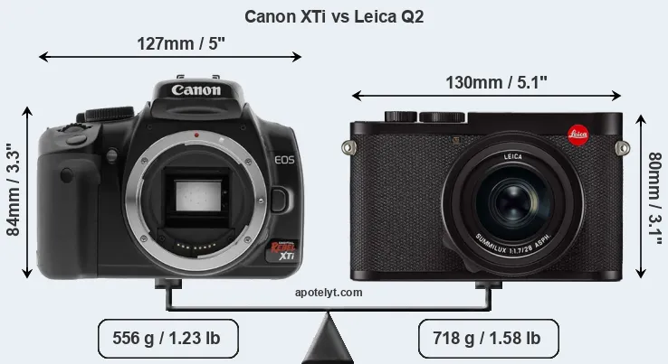 The side-by-side display below illustrates the physical size and weight of the Canon XTi and the Leica Q2. The two cameras are presented according to their relative size. Three consecutive perspectives from the front, the top, and the back are available. All width, height and depth measures are rounded to the nearest millimeter.