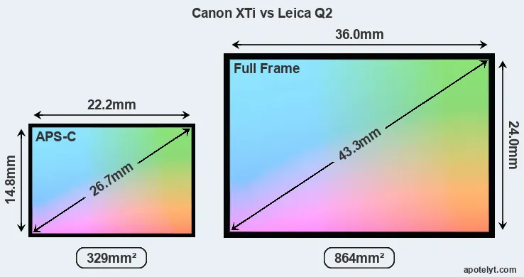 Of the two cameras under consideration, the Canon XTi features an APS-C sensor and the Leica Q2 a full frame sensor. The sensor area in the Q2 is 163 percent bigger. As a result of these sensor size differences, the cameras have a format factor of, respectively, 1.6 and 1.0. Both cameras have a native aspect ratio (sensor width to sensor height) of 3:2.