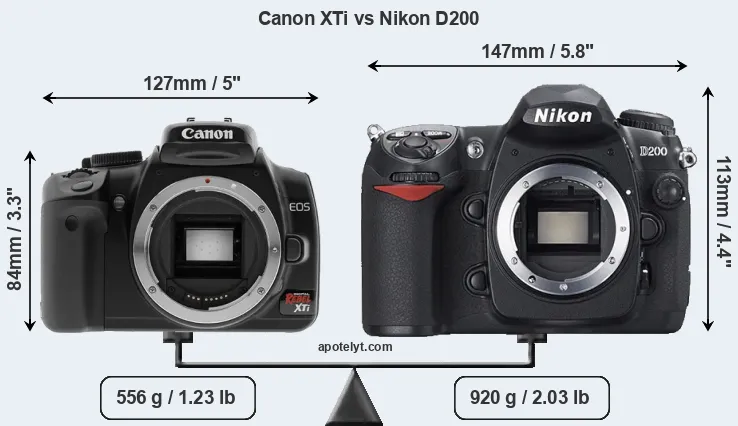 If the front view area (width x height) of the cameras is taken as an aggregate measure of their size, the Nikon D200 is considerably larger (56 percent) than the Canon XTi. Moreover, the D200 is substantially heavier (65 percent) than the XTi. It is noteworthy in this context that the D200 is splash and dust-proof, while the XTi does not feature any corresponding weather-sealing.