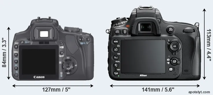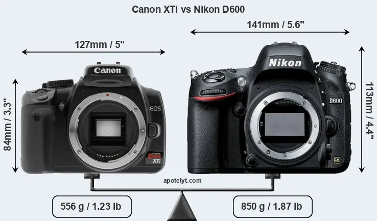 An illustration of the physical size and weight of the Canon XTi and the Nikon D600 is provided in the side-by-side display below. The two cameras are presented according to their relative size. Three successive views from the front, the top, and the rear are shown. All width, height and depth dimensions are rounded to the nearest millimeter.