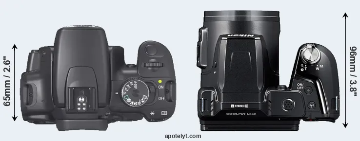 The side-by-side display below illustrates the physical size and weight of the Canon XTi and the Nikon L840. The two cameras are presented according to their relative size. Three consecutive perspectives from the front, the top, and the back are available. All width, height and depth dimensions are rounded to the nearest millimeter.