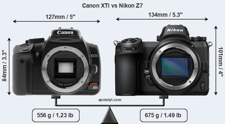 The side-by-side display below illustrates the physical size and weight of the Canon XTi and the Nikon Z7. The two cameras are presented according to their relative size. Three consecutive perspectives from the front, the top, and the back are available. All width, height and depth dimensions are rounded to the nearest millimeter.