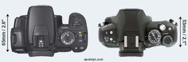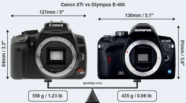 An illustration of the physical size and weight of the Canon XTi and the Olympus E-400 is provided in the side-by-side display below. The two cameras are presented according to their relative size. Three successive views from the front, the top, and the rear are shown. All width, height and depth dimensions are rounded to the nearest millimeter.