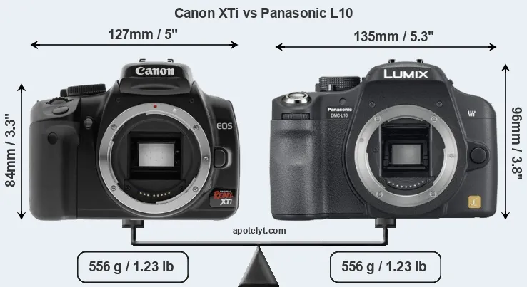 The side-by-side display below illustrates the physical size and weight of the Canon XTi and the Panasonic L10. The two cameras are presented according to their relative size. Three consecutive views from the front, the top, and the rear side are shown. All width, height and depth dimensions are rounded to the nearest millimeter.