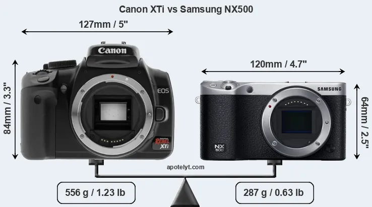 If the front view area (width x height) of the cameras is taken as an aggregate measure of their size, the Samsung NX500 is notably smaller (28 percent) than the Canon XTi. Moreover, the NX500 is substantially lighter (48 percent) than the XTi. In this context, it is worth noting that neither the XTi nor the NX500 are weather-sealed.