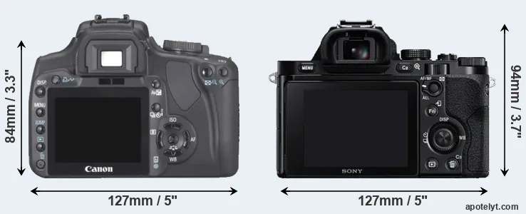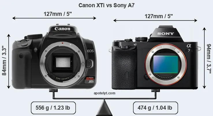 If the front view area (width x height) of the cameras is taken as an aggregate measure of their size, the Sony A7 is notably larger (12 percent) than the Canon XTi. However, the A7 is markedly lighter (15 percent) than the XTi. It is noteworthy in this context that the A7 is splash and dust-proof, while the XTi does not feature any corresponding weather-sealing.