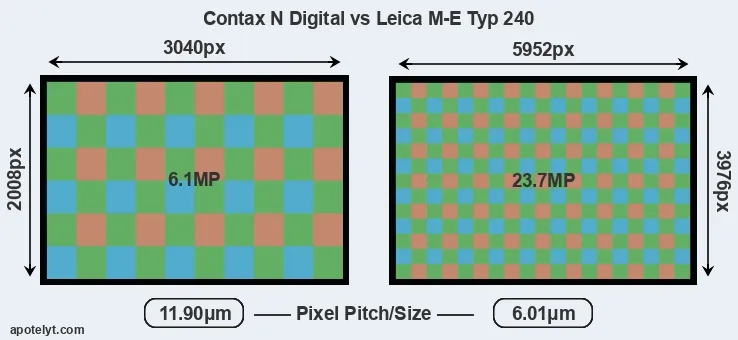 Despite having a slightly smaller sensor, the M-E Typ 240 offers a higher resolution of 23.7 megapixels, compared with 6.1 MP of the N Digital. This megapixels advantage comes at the cost of a higher pixel density and a smaller size of the individual pixel (with a pixel pitch of 6.01μm versus 11.90μm for the N Digital). However, it should be noted that the M-E Typ 240 is much more recent (by 17 years and 3 months) than the N Digital, and its sensor will have benefitted from technological advances during this time that make it possible to gather light more efficiently.