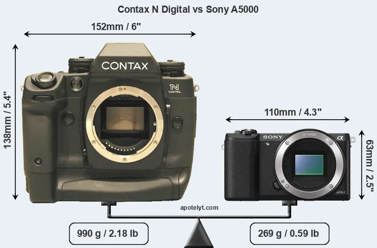 If the front view area (width x height) of the cameras is taken as an aggregate measure of their size, the Sony A5000 is considerably smaller (67 percent) than the Contax N Digital. Moreover, the A5000 is substantially lighter (73 percent) than the N Digital. In this context, it is worth noting that neither the N Digital nor the A5000 are weather-sealed.