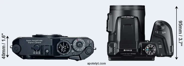 Going beyond this snapshot of core features and characteristics, what are the differences between the Epson R-D1 and the Nikon Coolpix B500? Which one should you buy? Read on to find out how these two cameras compare with respect to their body size, their imaging sensors, their shooting features, their input-output connections, and their reception by expert reviewers.