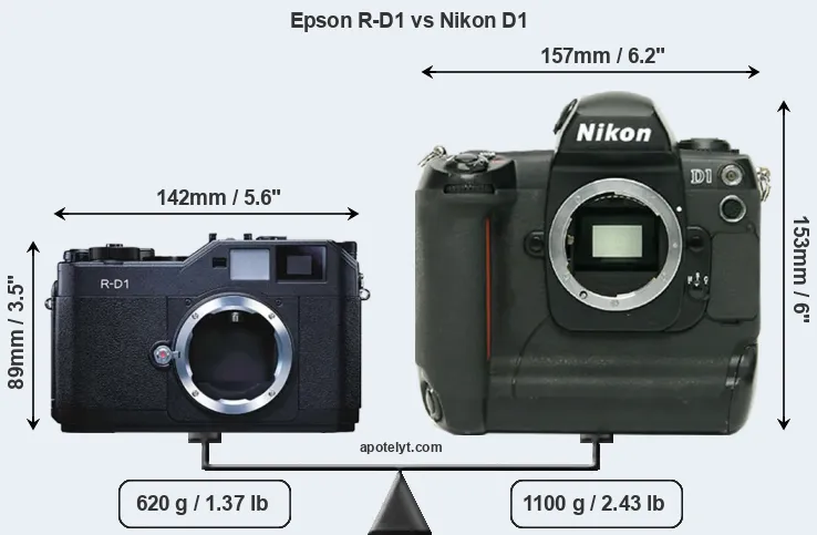 If the front view area (width x height) of the cameras is taken as an aggregate measure of their size, the Nikon D1 is considerably larger (90 percent) than the Epson R-D1. Moreover, the D1 is substantially heavier (77 percent) than the R-D1. It is noteworthy in this context that the D1 is splash and dust-proof, while the R-D1 does not feature any corresponding weather-sealing.
